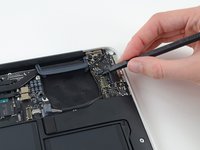 Grab the clear plastic pull tab attached to the battery connector and pull it parallel to the board toward the front edge of the Air.