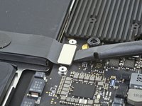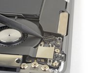 Slide the pointed end of a spudger underneath the left speaker cable and pry straight up to disconnect it from the logic board.