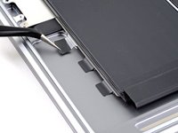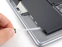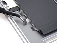 On the left side of the MacBook, use a pair of tweezers to peel back the three black pull tabs on the battery's stretch-release adhesive strips until you can grip them with your fingers.