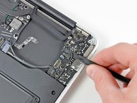 Pull the camera cable parallel to the face of the I/O board toward the corner of the Air to disconnect it from its socket, using the tip of a spudger to help push the connector out of its socket.