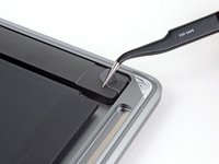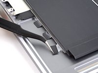 On the left side of the MacBook, use a pair of tweezers to peel back the three black pull tabs on the battery's stretch-release adhesive strips until you can grip them with your fingers.
