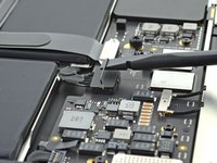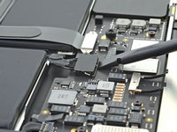 Use the flat end of a spudger to pry up and unlatch the metal locking arm on the battery connector.