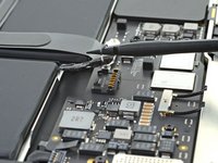 Lift straight up on the metal locking arm to pull the battery connector out of its socket on the logic board.