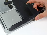 Grab the clear plastic pull tab attached to the battery connector and pull it toward the front edge of the Air to disconnect the battery from the logic board.