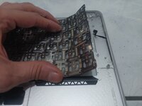 The backlight consists of 3 layers, the very fragile backlight covering, a clear plastic layer and a very fragile keyboard layout template. We DO NOT want to damage these in any way if we are to use them again, so ultimate care is needed. They are stuck together but with plenty of care they can be separated.
