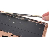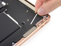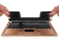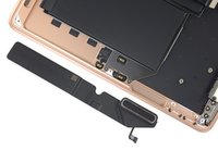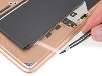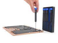 - The battery is secured with a combination of screws and repair-friendly stretch-release adhesive—but you'll have to remove the logic board and speakers for access.