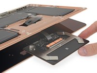 Unlike the newer MacBooks Pro, which have first-step replaceable trackpads, this trackpad shares a cable with the keyboard, which is pinned under the logic board.