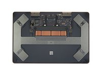 The trackpad contains a Broadcom BCM5976C1 touch controller, a STMicroelectronics STM32F103B6 32-bit ARM Cortex-M3 microcontroller, a Macronix MX25L2006EZUI-12G 2 Mb serial flash memory, a Monolithic Power Systems MP6519 H-bridge current regulator, and a Maxim Integrated MAX11390A 10-bit analog to digital converter (likely).