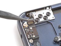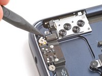 Use the point of a spudger to pry up and disconnect the lid angle sensor from the top left corner of the MacBook.