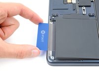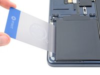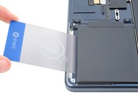 Push the plastic card underneath the metal tray and slide it back and forth to slice the remaining adhesive. You may need to lift the battery cell to reach the adhesive.