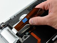 Disconnect the port hatch ribbon cable from the logic board by pulling it straight up by its black pull tab.