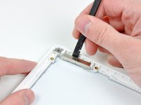 Using a spudger, gently pry up the white plastic slot and slide the metal c-channel to the right and away from the display.