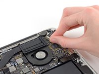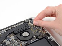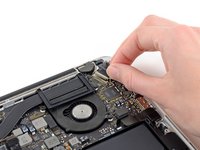 Grab the black pull tab secured to the display data cable lock and rotate it toward the DC-In side of the computer.