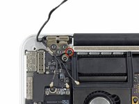 Use the flat end of a spudger to pry and disconnect the three antenna cable connectors from the AirPort board.