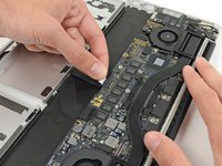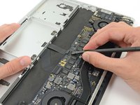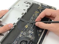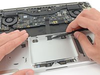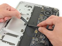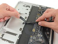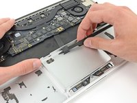 Carefully wedge a spudger or plastic card inwards, being careful to not damage the battery, and separate the battery cell from the adhesive securing it to your MacBook Pro.
