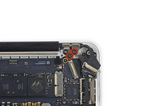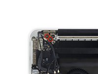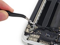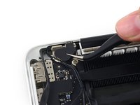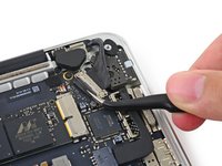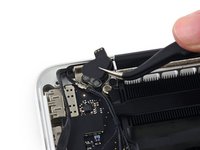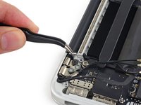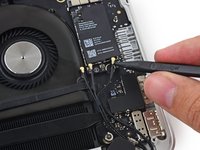Insert the tip of a spudger under each of the antenna cables near their connectors and pry up to disconnect them from the AirPort board.