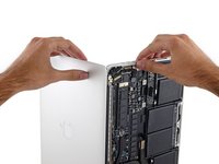 Grab the upper case with your right hand and rotate it slightly clockwise, toward the top of the display, so the display brackets clear the edge of the upper case.