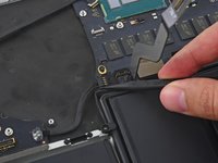 Insert the tip of a spudger under each of the antenna cables near their connectors and pry up to disconnect them from the AirPort board.