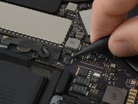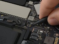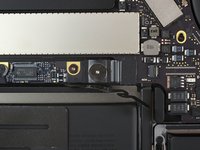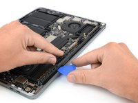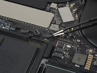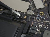 Carefully peel up the large piece of tape covering the battery connector, on the edge of the logic board nearest the battery.