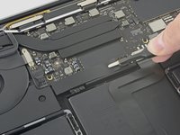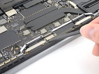 Remove the four 1.5 mm T3 Torx screws securing the two aluminum covers on top of the two display cable connectors.