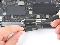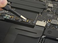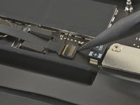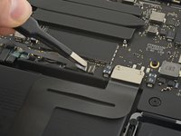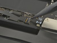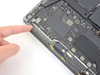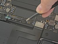 Carefully peel up the large piece of tape covering the battery connector, on the edge of the logic board nearest the battery.