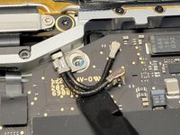 Gently pry & pull away the antenna cable from the Macbook while routing it's cable through their hole. Take care here, as the antenna sockets can be ripped from the board easily.