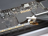Remove the two 1.7 mm T3 Torx screws securing the aluminum cover on top of the display cable flex connector.