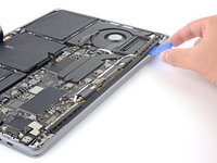 Carefully peel up the large piece of tape covering the battery connector, on the edge of the logic board nearest the battery.