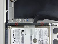 Remove two Phillips screws securing the hard drive bracket to the upper case.