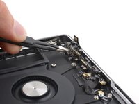 Peel back the tape covering the left speaker ZIF connector on the right side of the logic board.