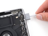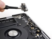 Use the flat end of your spudger to pry up and disconnect the MagSafe port press connector.