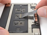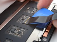 The battery data cable is adhered to the battery board and logic board. In the next few steps, you'll disconnect it, separate its adhesive, and remove it.