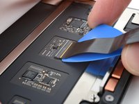 Use the point of your spudger to flip up the small locking flap on the logic board battery data ZIF connector.