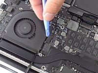 Starting at the top of the cable, slide a plastic opening tool under the right fan cable to free it from the logic board.