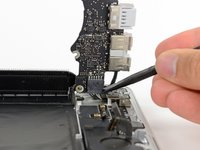 Use the flat end of a spudger to pry the left speaker connector up and out of its socket on the logic board.