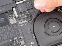 Use the tip of a spudger to flip up the retaining flap on the left fan ribbon cable ZIF socket.