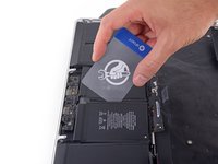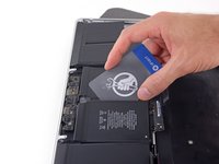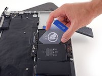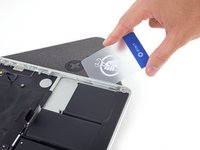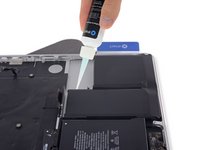 Slide the card farther underneath the battery cell to separate it from the adhesive securing it to the MacBook Pro's upper case.