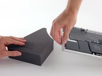 With the front edge of the MacBook Pro facing you, lift the right side and prop it up at a slight angle, using a sturdy foam block or book.