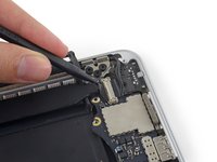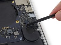 Use the flat end of a spudger to pry the left speaker connector up and out of its socket on the logic board.