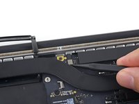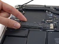 Leave them attached. Remove the single screw holding the board in place and gently wiggle the airport card out (see Airport card removal instructions). Fold the card up and towards the rear of the computer. Now follow the instructions for the camera cable removal. Lift the airport card with the three leads attached and the camera cable up and fold the, to the outside of the case. This video shows how to do it safely: https://www.youtube.com/watch?v=AabLlHT5... Undo the 3 cables gently. remove the airport card. gently pry away the cables fro the fan plastic. then the camera cable will slide out easily. I was afraid to just pull on any cables adhered, so I used a spudger edge to very gently “scrape” them up instead. It was much easier following the instructions on the YouTube video, thanks! Looks like the process starts around 4:11. why are we completely tearing the computer, just to replace the battery? surely tearing it down could do more damage than being careful removing the bloated battery