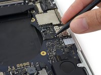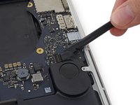 Use the tip of a spudger to pry the right speaker connector up and out of its socket on the logic board.