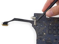 Use the tip of a spudger to flip up the retaining flap on the left fan ribbon cable ZIF socket.