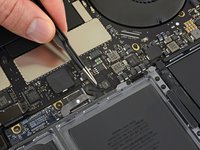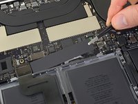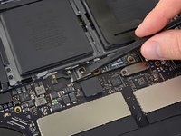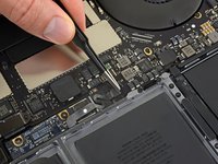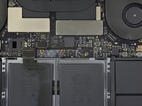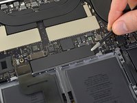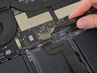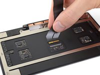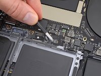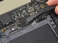 Peel up and remove the large rectangular battery board cover, on the edge of the logic board nearest the battery.