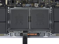 Apply mild heat to the trackpad ribbon cable to soften the adhesive securing it to the battery.