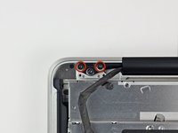 Remove the outer two T6 Torx screws securing both display hinges to the upper case (four screws total).