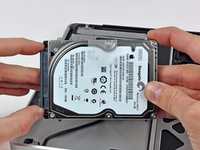 Lift the hard drive by its pull tab and pull it out of the chassis, minding the cable attaching it to the computer.