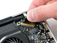 Grab the plastic pull tab secured to the LVDS cable lock and rotate it toward the DC-in side of the computer.