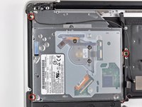 Carefully peel the battery warning label off the upper case between the battery and the optical drive to reveal an additional Tri-point screw.