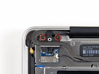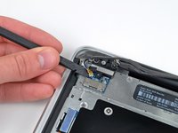 Use the flat end of a spudger to carefully pry the AirPort antenna off its socket on the AirPort card.
