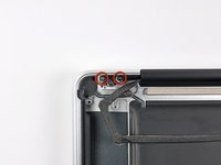 Remove the outer two T6 Torx screws securing both display hinges to the upper case (four screws total).
